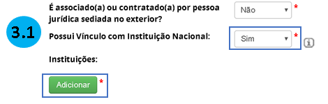 Uma atenção especia deverá ser dada no item do vinculo institucional. Para os pesqusiadores com vinculo empregatício com a UFCG, no item “Possui Vinculo com Instituição Nacional” deverá ser escolhida a opção “SIM”, e em seguida prosseguir para o botão adicionar a Instituição.