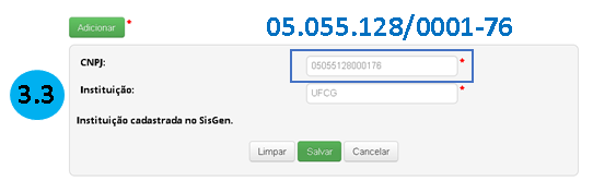 Na continuação do cadastro da vinculação, o pesquisador deverá informar apenas o CNPJ da instituição, que automaticamente o campo seguinte será preenchido com o nome UFCG, e em seguida selecionar a opção “Salvar”.